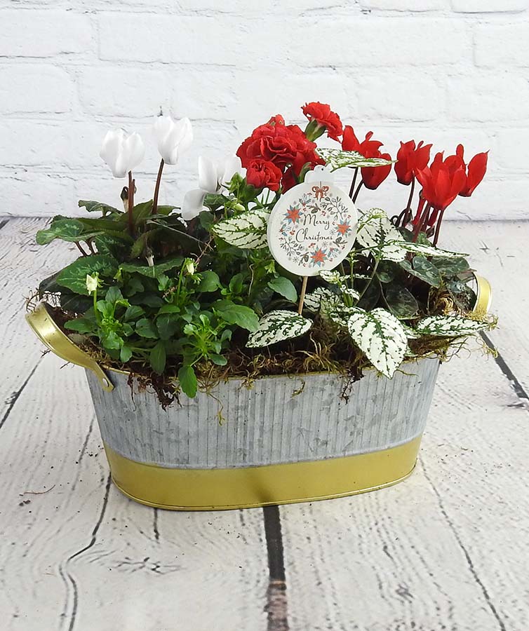 A seasonal collection of 4 indoor flowering plants in an eye catching red and white festive colour scheme . We use the best looking and healthiest seasonal plants available and so the selection can change from week to week, These are presented in an attractive zinc metal planter with a gold coloured trim and finished with a Merry Christmas Stake as pictured.