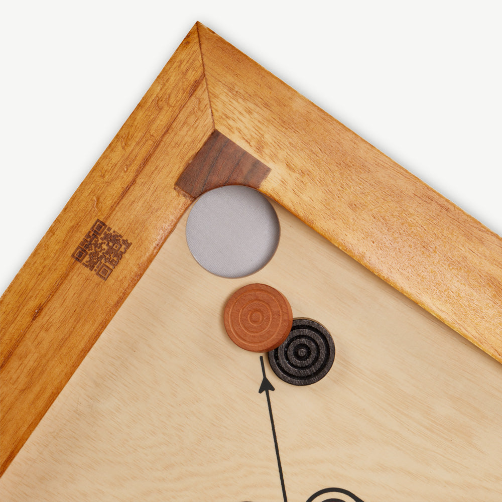 The Heritage Carrom Set is the perfect board for younger players, and families or as an entry-level board. Our carrom board edges are made of 2″ Drake Wood with Kikar detail corners for the ideal rebound and the playing surface is made from 4mm thick special Carrom Mango Plywood which has been polished for a smooth low friction and hard wearing finish.