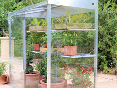 The two wide seed tray shelves can be adjusted for height and can be removed or dropped flat when not required in summer. Slim aluminium bars reduce shading of the plants below.