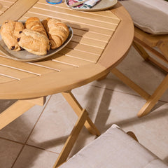 The Ashdown Folding 4 Seat Dining Set With Cushions comprises of a round table and four chairs with comfortable seat pads.