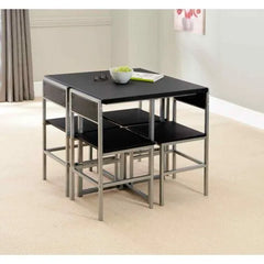 Space saving in design, this dining set is ideal for any kitchen or living area where space is a premium. All four chairs neatly store against the table top. Powder coated silver frame with a 30mm black MDF veneer top. The chairs have a 15mm MDF seat with a padded cushioned backrest.