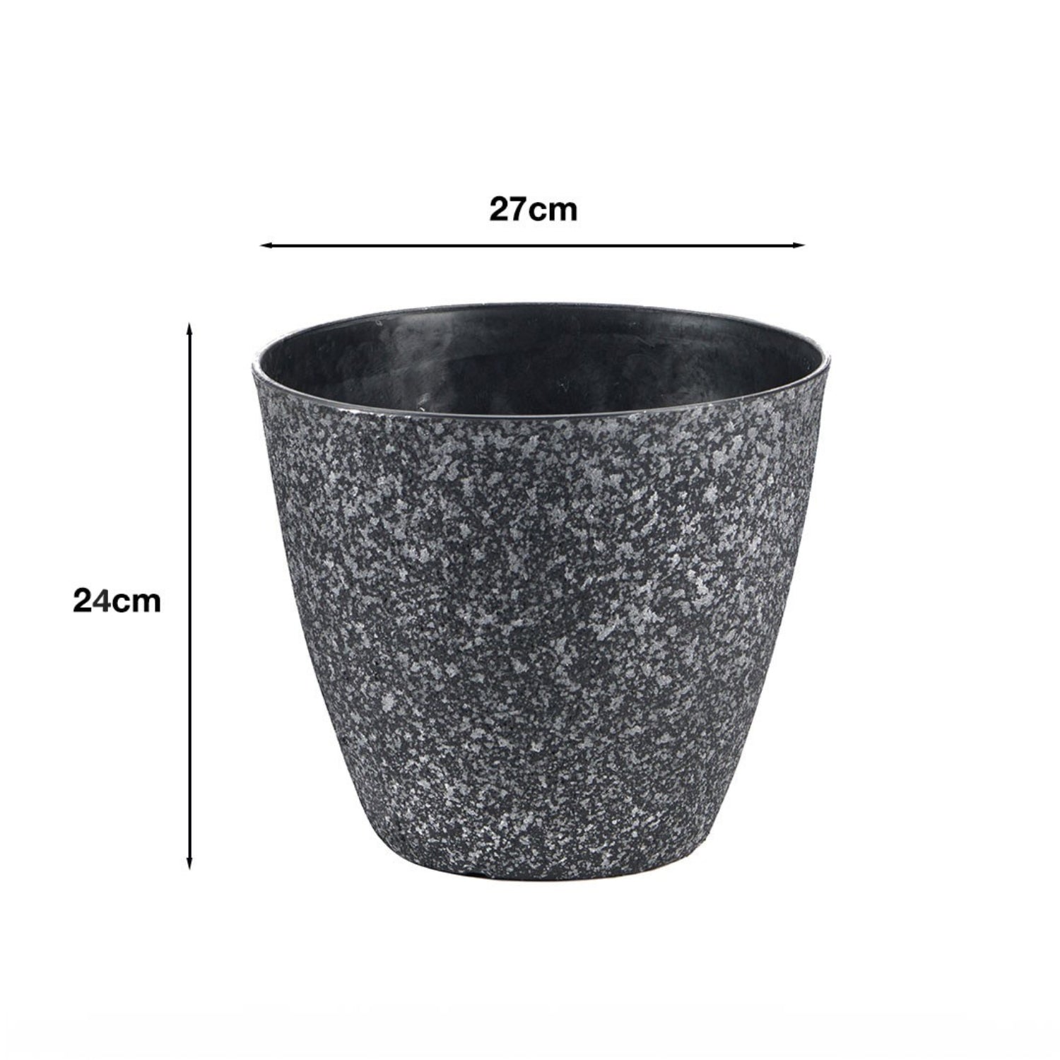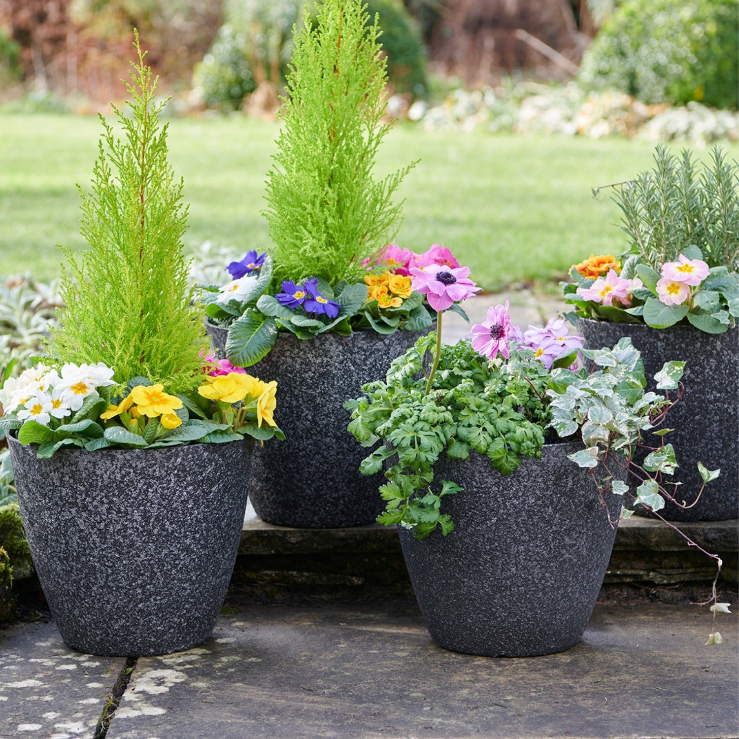 Add a touch of style to any garden, patio, balcony, or terrace with this set of four black Granite effect textured planters. Supplied as a pack of four these planters will suit both traditional and modern gardens. Although they look and feel like solid heavy granite they are manufactured from UVstabilised polyurethane. They are highly durable, lightweight, and weather resistant ensuring a practical and maintenance-free planter that will retain its attractive appearance all year round.