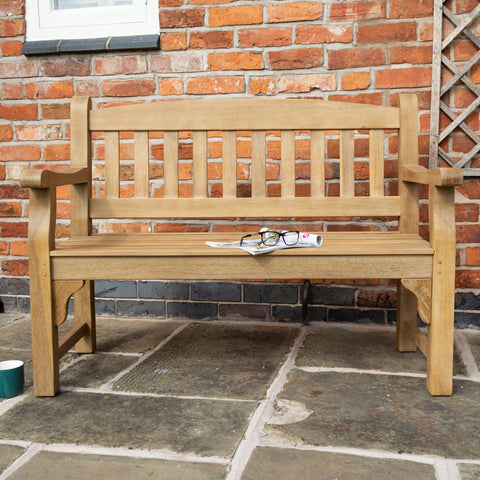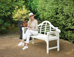 Relax in style in your garden with this traditionally designed Lutyens garden bench in a contemporary white finish. Beautifully crafted from sustainable Acacia a smooth natural hardwood renowned for its strength, durability and resilience to weathering. Hand oiled. Home assembly required.