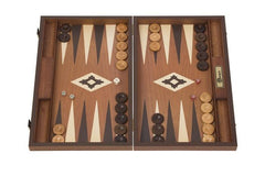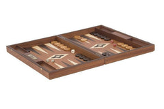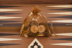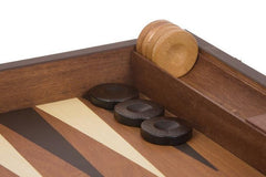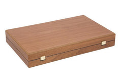With a mahogany veneer playing surface and storage sections for the oak counters located at either end of the board, this good-looking backgammon set guarantees hours of tactical and strategic gaming. Easy to pack up and transport, the set folds in half and is neatly secured with two polished brass fasteners.