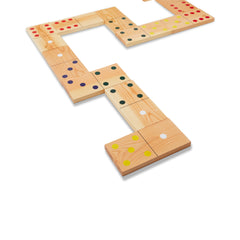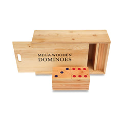 Each mega domino is made of pine wood and measures 250mm x 125mm x 17mm. The set comprises 28 high quality mega dominoes, colour co-ordinated for ease of play and comes in a wooden storage box.