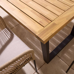 With a bold, cotemporary design, the Oslo 4 Seat Dining Set provides the perfect place for family meals and social occasions. The strong dark grey steel table and chair legs have a distinctive contrast with the warm tone of the acacia hardwood table top, as well as the calming natural coloured rope weave of the dining chairs. With enough space to seat eight in comfort, the Oslo is an stylish dining set for both indoor and outdoor use.