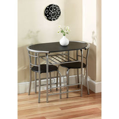 This stylish and compact table is perfect for breakfast or an intimate dinner for two. Space saving in design, this set is ideal for any kitchen or living area where space is a premium.It can be tucked under when not in use. The set is lightweight yet strong and easy to move around and the table features a useful shelf for storage. It has been manufactured with a study powder coated silver steel frame with laminated black MDF tabletop and chair seats.